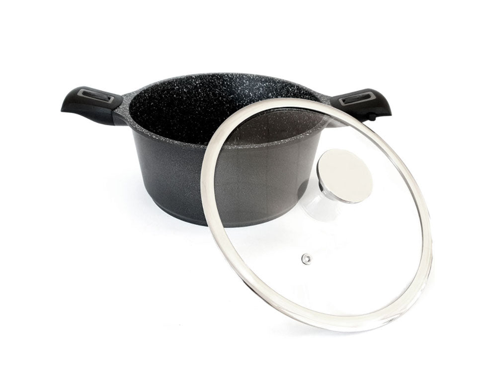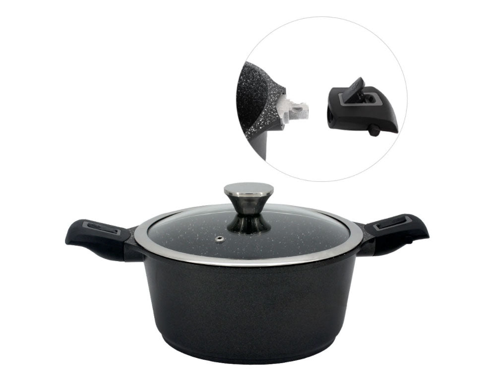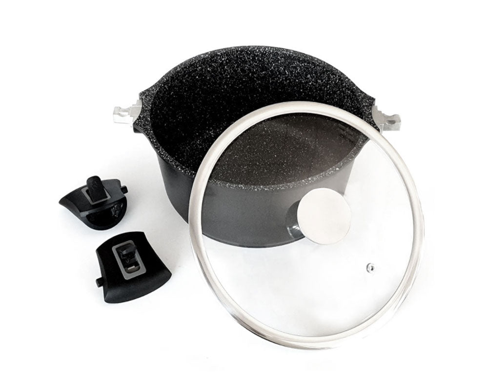 Cratiță din aluminiu forjat de înaltă calitate, cu înveliș antiaderent din marmură și mânere detașabile, potrivită pentru toate tipurile de plite, inclusiv inducție, precum și pentru cuptor.