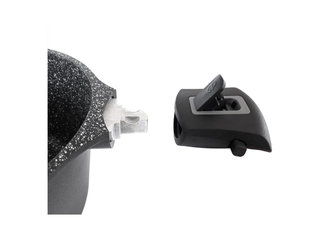 - Mâner detașabil din bachelită pentru protecție maximă a mâinilor și confort. Când mânerul este îndepărtat, oala poate fi folosită în siguranță în cuptor.