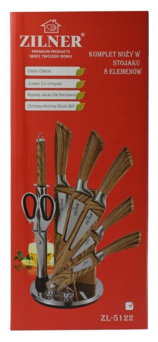 Cuțit universal: 12,5 cm Cuțit de bucătar: 15 cm Cuțit universal: 10 cm Cuțit de curățat: 7,5 cm Decojitor Suport acrilic pentru cuțit