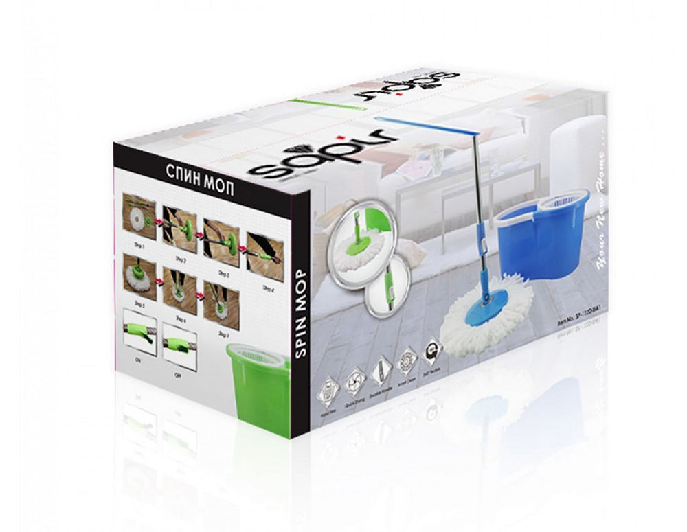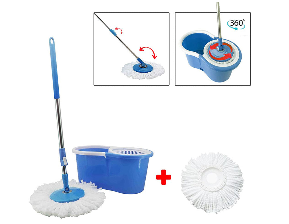 Kit de curățare cu un mecanism rotativ unic care permite stoarcerea ușoară a mopului în centrifugă fără a atinge apa murdară cu mâinile.