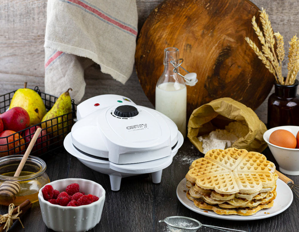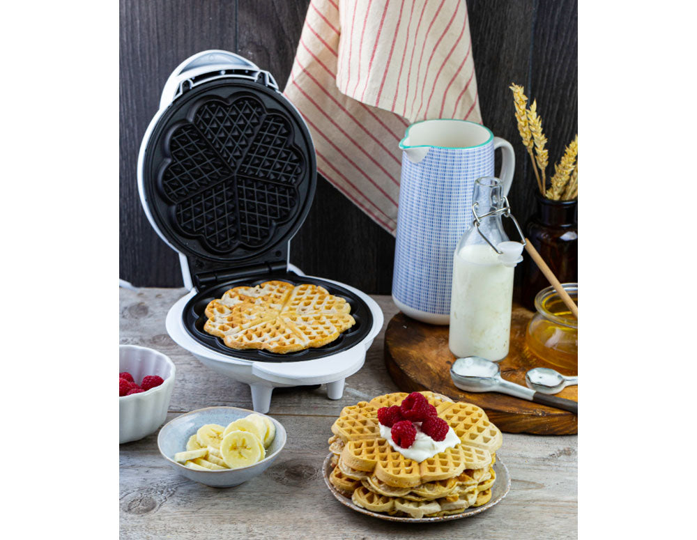 Aparat de vafe cu o putere de 1000 W, echipat cu termostat. Este perfect pentru prepararea de vafe crocante. Pregătește 5 vafe în formă de inimă simultan. Este echipat cu plăci acoperite, ceea ce face curățarea foarte ușoară. De asemenea, este foarte ușor de transportat datorită spațiului de depozitare a cablului și a posibilității de a sta în poziție verticală.