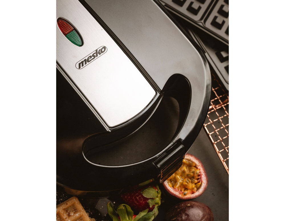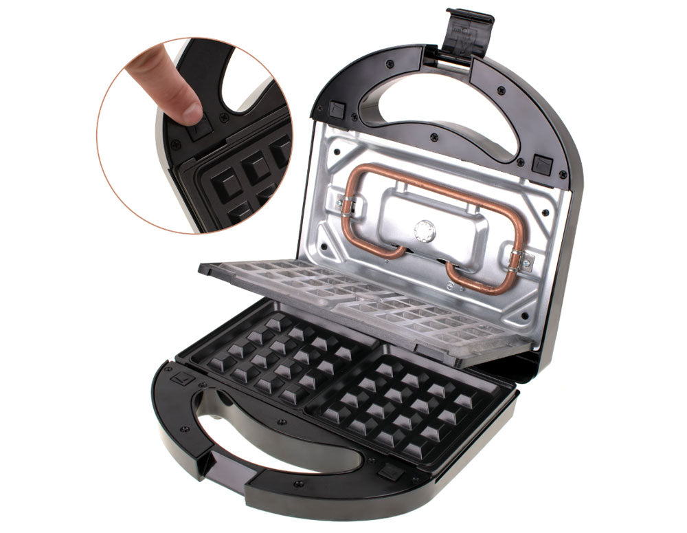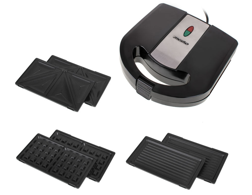Prăjitor de pâine practic 3 în 1 cu o putere maximă de 1000W. Datorită celor trei plăci de încălzire mobile, aparatul vă permite să preparați vafe crocante, sandvișuri delicioase sau legume sau carne la grătar. Învelișul special al plăcilor de încălzire previne lipirea, ceea ce face aparatul ușor de curățat. Termostatul semnalează o încălzire suficientă a plăcilor și asigură temperatura corectă pe tot parcursul procesului de prăjire. Datorită acestui fapt, produsele preparate sunt crocante și aurii.
